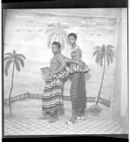 Full portrait of two young girls standing, wearing camisoles and loincloth skirts, one wearing a full length black skirt and the other with her hand on her hip, in front of a curtain with three palm trees, facing forward