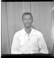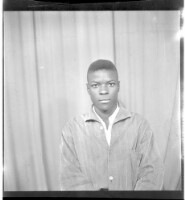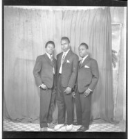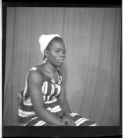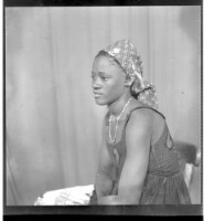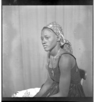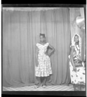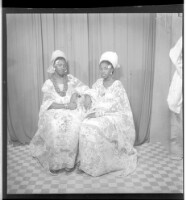 Two young girls standing, in the foreground one wears a full camisole and a white headscarf, in the background a young girl is standing, facing forward