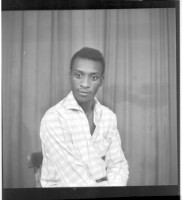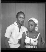 A couple, a young girl sitting wearing a camisole, earrings, a headscarf, and a necklace, with a man wearing a white short sleeve t-shirt and holding the woman, facing forward