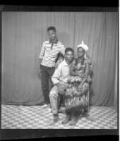 Full portrait of three people, a man sitting wearing a shirt and pants, with a young girl wearing a camisole, a full length loincloth skirt, a white headscarf, and a necklace, and a man standing wearing a t-shirt and a watch, facing forward