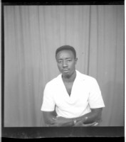 A couple sitting, to the left a woman wearing a camisole, a loincloth skirt, and necklaces, with a man sitting, wearing a white and black boubou and a watch, facing forward