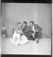Full portrait of three young people, a girl and two men kneeling, two young men dressed the same, wearing white shirts and black suits, the young girl wearing a white dress, a hairstyle, a smile, and a watch, facing forward