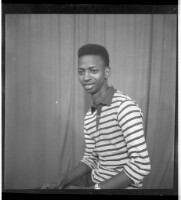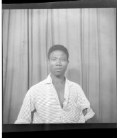 Full portrait of three young men standing, to the left a man wears a grey t-shirt and pants, in the middle a man wearing a black and white shirt, black pants, black shoes, and a watch, to the right a man wears a grey shirt, pants, grey shoes and a watch,