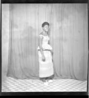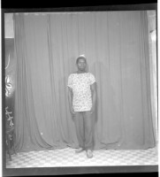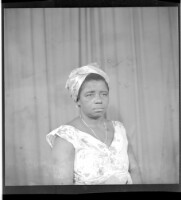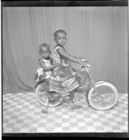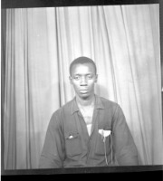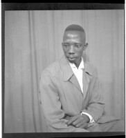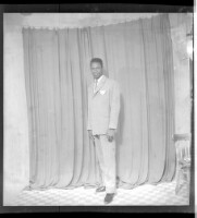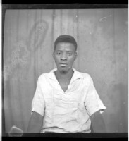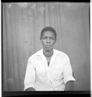 Full portrait of three men standing, to the left a man wears a white boubou and a black and white bonnet, in the middle a man wears a black boubou, a watch, and a bonnet, to the right a young man wears a grey shirt, black pants and a hat, facing forward