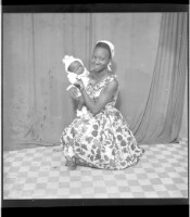 575. EAP449/2/20/575 Reference (shelfmark): EAP449/2/20/575 Title: Full portrait of a woman smiling and kneeling, wearing a dress, a headscarf, and a necklace, with her baby wearing white, facing forward Collection Area: Endangered Archives Programme Languages: Not applicable Date Range: 2nd half od the 20th century Extent: 1 TIFF image