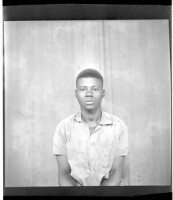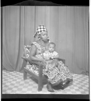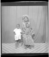 Full portrait of a woman sitting on a chair, wearing a camisole and matching head scarf, with two children, one boy standing wearing a white t-shirt and with his hand in his pocket and the other boy sitting on his mother, facing forward