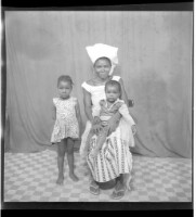 Copy of a full portrait of four people, a woman sitting wearing a boubou, a loincloth, and a head scarf, with a little girl sitting on her, to her left and right are two young boys standing wearing one wearing a t-shirt and the other a black shirt, facin