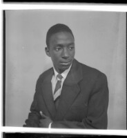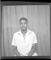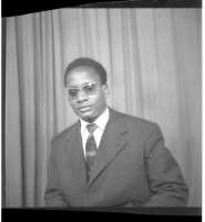 A couple, a young girl wearing a tussu dress, a head scarf, earrings and a necklace with a man wearing a white shirt and a full black suit, standing and facing forward