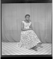 A woman sitting on a chair and wearing a camisole, a full black loincloth, a head scarf, a necklace, earrings and a watch , with arms crossed facing sideways