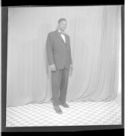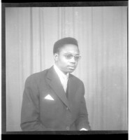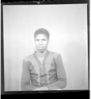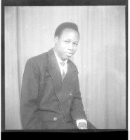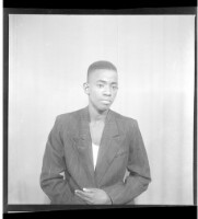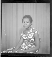 A woman wearing a dress and a headscarf, sitting full frontal view in between a man wearing a tie and a cigarette hanging out of his mouth, standing profile view, and the other wearing a shirt, pants and a hat, standing full frontal view in the studio.