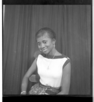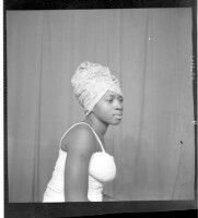 A woman wearing a dress, a headscarf, and a chain necklace, sitting profile view in front of a man wearing a shirt and pants, standing facing forward in the studio.