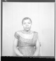 A girl wearing a dress, a headscarf, and necklaces, sitting full frontal view in front of two men: one wearing a suit and a tie, standing profile view, and the other wearing a shirt, a tie, pants, and a hat, both standing full frontal view in the studio.