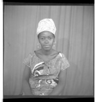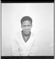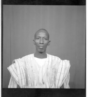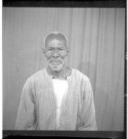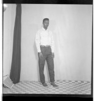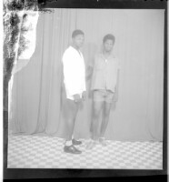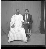 A man wearing a shirt, pants, and a cap, standing profile view next to another wearing a jacket, a tie, and pants, standing full frontal view in the studio.