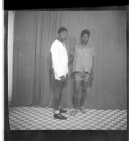 201. EAP449/2/21/201 Reference (shelfmark): EAP449/2/21/201 Title: Two boys wearing shirts and shorts; one wearing glasses, standing profile view and the other standing full frontal view in the studio. Collection Area: Endangered Archives Programme Languages: Not applicable Date Range: 2nd half od the 20th century Extent: 1 TIFF image