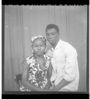 205. EAP449/2/21/205 Reference (shelfmark): EAP449/2/21/205 Title: A man wearing a shirt, sitting profile view next to a woman wearing a dress, and a headscarf, sitting full frontal view in the studio. Collection Area: Endangered Archives Programme Languages: Not applicable Date Range: 2nd half od the 20th century Extent: 1 TIFF image