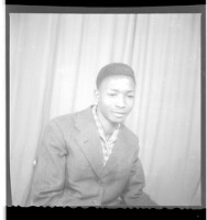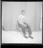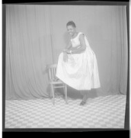 A woman wearing a dress and a headscarf, sitting full frontal view and a baby girl at her side, in front of a man wearing a shirt and pants, and a man wearing a boubou and a hat, standing full frontal view in the studio.
