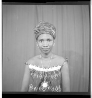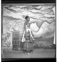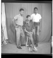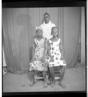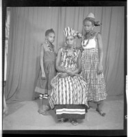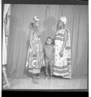 A boy wearing a shirt and shorts, standing facing forward in between two women wearing dresses, headscarves, and necklaces, both standing profile view in the studio.