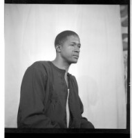 A man wearing a shirt and shorts, sitting profile view in between two men wearing shirts and pants, one standing full frontal view and the other standing profile view in the studio.