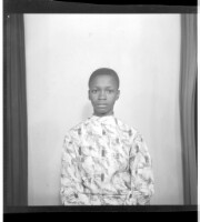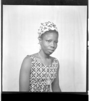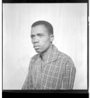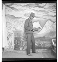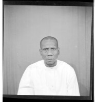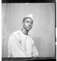 A man wearing a boubou and a cap, sitting facing forward in between two men: one wearing a boubou and a hat, standing profile view, and the other wearing a boubou and a jacket, standing facing forward in the studio.