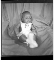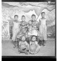 Two little girls wearing dresses and necklaces: one sitting facing forward and the other sitting profile view in front of two other girls wearing dresses and necklaces, one sitting full frontal view and the other sitting profile view with a baby on her la
