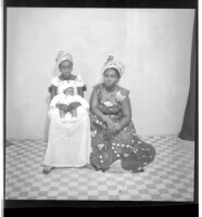311. EAP449/2/21/311 Reference (shelfmark): EAP449/2/21/311 Title: Two women wearing dresses and headscarves, one who is wearing a necklace and holding a baby on her lap, sitting facing forward and the other wearing a chain necklace, sitting profile view in the studio. Collection Area: Endangered Archives Programme Languages: Not applicable Date Range: 2nd half od the 20th century Extent: 1 TIFF image