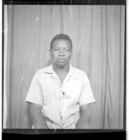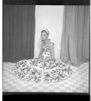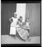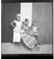 A girl wearing a robe pagne (wrapper dress) and necklaces, sitting profile view in between two little girls wearing dresses: one wearing a pagne (wrapper) and a headscarf, and the other wearing a skirt; both standing facing forward in the studio.