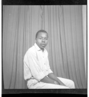 A girl wearing a robe pagne (wrapper dress) and necklaces, sitting profile view in between two little girls wearing dresses: one wearing a pagne (wrapper) and a headscarf, and the other wearing a skirt, both standing facing forward in the studio.