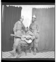 Three men wearing military uniforms: one is holding a guitar, sitting facing forward in the middle of two others, who are standing profile view in the studio.