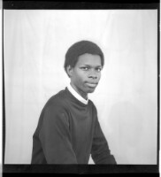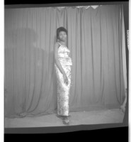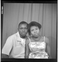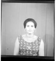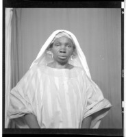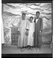 A woman wearing a dress, a headscarf, and a chain necklace, holding a baby on her lap, sitting among 4 little girls wearing dresses, standing facing forward, in front of two boys wearing shirts and who are standing facing forward in the studio.