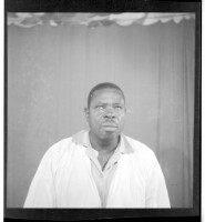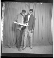 Two men: one wearing a shirt and pants, holding a white paper and another wearing a jacket and pants, both standing profile view looking down at the paper in the studio.
