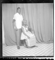 32. EAP449/2/21/32 Reference (shelfmark): EAP449/2/21/32 Title: A girl wearing a robe pagne (wrapper dress), a headscarf, and necklaces, sitting profile view in front of a man wearing a shirt and pants, standing profile view in front in the studio. Collection Area: Endangered Archives Programme Languages: Not applicable Date Range: 2nd half od the 20th century Extent: 1 TIFF image