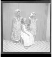 33. EAP449/2/21/33 Reference (shelfmark): EAP449/2/21/33 Title: Three girls wearing dresses, headscarves, and necklaces, one of whom is sitting profile view and two who are sitting full frontal view in the studio. Collection Area: Endangered Archives Programme Languages: Not applicable Date Range: 2nd half od the 20th century Extent: 1 TIFF image