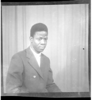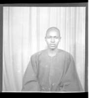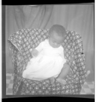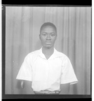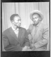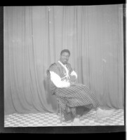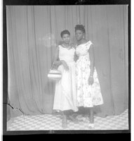 Two girls wearing dresses: one wearing a chain necklace and holding a handmade purse, standing facing forward, and the other standing profile view in the studio.
