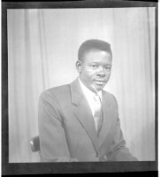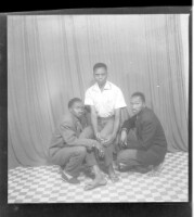 Three men: one wearing a shirt, pants, and glasses, sitting facing forward in between two others wearing suits and both sitting profile view in the studio.