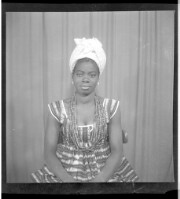422. EAP449/2/21/422 Reference (shelfmark): EAP449/2/21/422 Title: A girl wearing a dress, a headscarf, and necklaces, sitting profile view in the studio. Collection Area: Endangered Archives Programme Languages: Not applicable Date Range: 2nd half od the 20th century Extent: 1 TIFF image