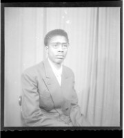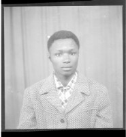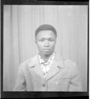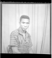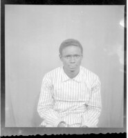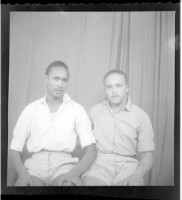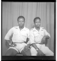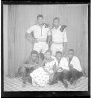 A girl wearing a dress and a necklace, sitting facing forward among three boys: one wearing a suit and sitting profile view, and two wearing a shirts and pants, both sitting, one facing forward and one profile view, in front of two men dressed in militar