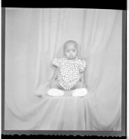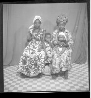 A little girl wearing a dress, standing profile view in between two women wearing dresses, headscarves, and necklaces, one is holding a baby on her lap and both are sitting full frontal view.