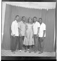 167. EAP449/2/22/167 Reference (shelfmark): EAP449/2/22/167 Title: Five people, four men wearing shirts and pants standing in profile and a woman wearing a dress standing face-forward in the studio. Collection Area: Endangered Archives Programme Languages: Not applicable Date Range: 2nd half od the 20th century Extent: 1 TIFF image