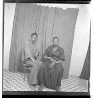 169. EAP449/2/22/169 Reference (shelfmark): EAP449/2/22/169 Title: Two men wearing boubous sitting on chairs, one face-forward and the other in profile in the studio. Collection Area: Endangered Archives Programme Languages: Not applicable Date Range: 2nd half od the 20th century Extent: 1 TIFF image