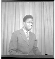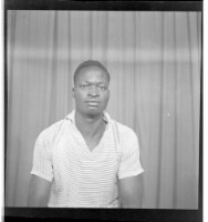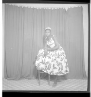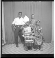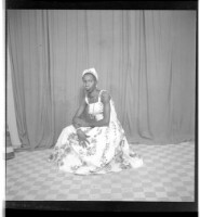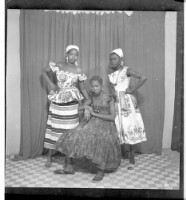 Three people, a man wearing a large boubou with a guitar sitting on the ground and two women wearing large pagnes sitting, one in profile and the other face-forward on a chair in the studio.