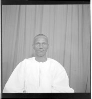 221. EAP449/2/22/221 Reference (shelfmark): EAP449/2/22/221 Title: A man wearing a white boubou sitting face-forward in the studio. Collection Area: Endangered Archives Programme Languages: Not applicable Date Range: 2nd half od the 20th century Extent: 1 TIFF image