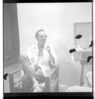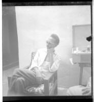 225. EAP449/2/22/225 Reference (shelfmark): EAP449/2/22/225 Title: A man wearing a shirt, pants, and glasses sitting in profile on a chair with his legs crossed. Collection Area: Endangered Archives Programme Languages: Not applicable Date Range: 2nd half od the 20th century Extent: 1 TIFF image