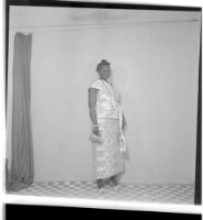 481. EAP449/2/22/481 Reference (shelfmark): EAP449/2/22/481 Title: Copy of a full portrait of a woman standing, wearing a camisole, a white full length loincloth skirt, a handbag and a white necklace, facing sideways Collection Area: Endangered Archives Programme Languages: Not applicable Date Range: 2nd half od the 20th century Extent: 1 TIFF image