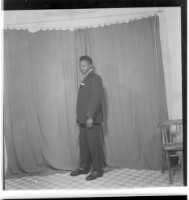484. EAP449/2/22/484 Reference (shelfmark): EAP449/2/22/484 Title: Full portrait of a man standing wearing a shirt and a black suit, next to an empty chair, facing sideways Collection Area: Endangered Archives Programme Languages: Not applicable Date Range: 2nd half od the 20th century Extent: 1 TIFF image