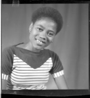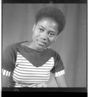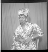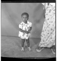 Two women sitting on a chair, to the left one wears a dress, a hairstyle and a headscarf, arms crossed, to the right a young girl sits wearing a white dress, a headscarf, and earrings, facing forward
