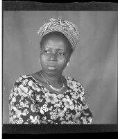 Three women, to the left a woman sits on a chair wearing a camisole, a loincloth skirt, a gold necklace, a headscarf and coins, in the middle a woman wears a dress and a white headscarf, arms crossed, to the right a woman wears a dress, a headscarf, earri