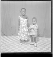 Full portrait of two couples, a couple sits, to the left a man wears a white shirt and a velour suit, a young girl sitting wears a dress and a whites headscarf, arms crossed, the other couple is standing wearing, to the left a young girl wears a grey dres