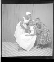 Three young girls, to the left a young girl standing wears a white dress and a white headscarf, the girls hold each other, in the middle one wears a white dress and a white headscarf, to the right a girl wears a grey dress, a hairstyle, a full length cami