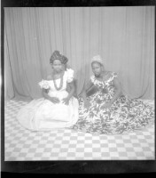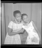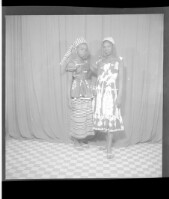 Two young girls standing, on the left one is wearing a camisole, a loincloth skirt, and a headscarf, they hold each other, to the right the other girl wears a black and white dress and a headscarf, facing forward