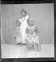 Full portrait of three people, to the left a little girl standing wears a camisole and a loincloth skirt, an old woman standing wearing a white boubou, a black headscarf, and a necklace, to the right a young girl sitting on a chair wearing a grey dress an